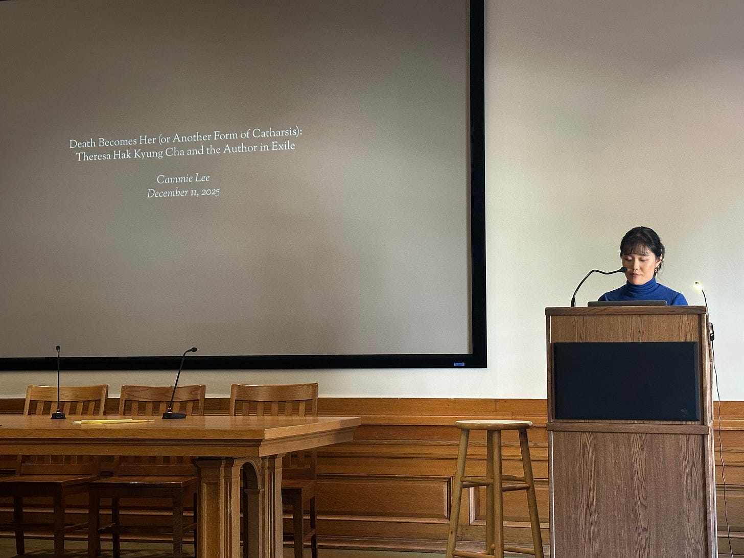 I ended up selecting as my text an edited collection of work by Theresa Hak Kyung Cha, who is most famous for her experimental autobiographical text Dictée. Cha attended Berkeley in the 70s, and received four degrees from the institution by the time she graduated in 1978. Her archives reside at the Berkeley Art Museum and Pacific Film Archive, and constitute the majority (over fifty percent) of the BAMPFA’s research requests. It seemed like the logical decision to write about Cha—well within my magical thinking of having fatefully arrived at Berkeley.